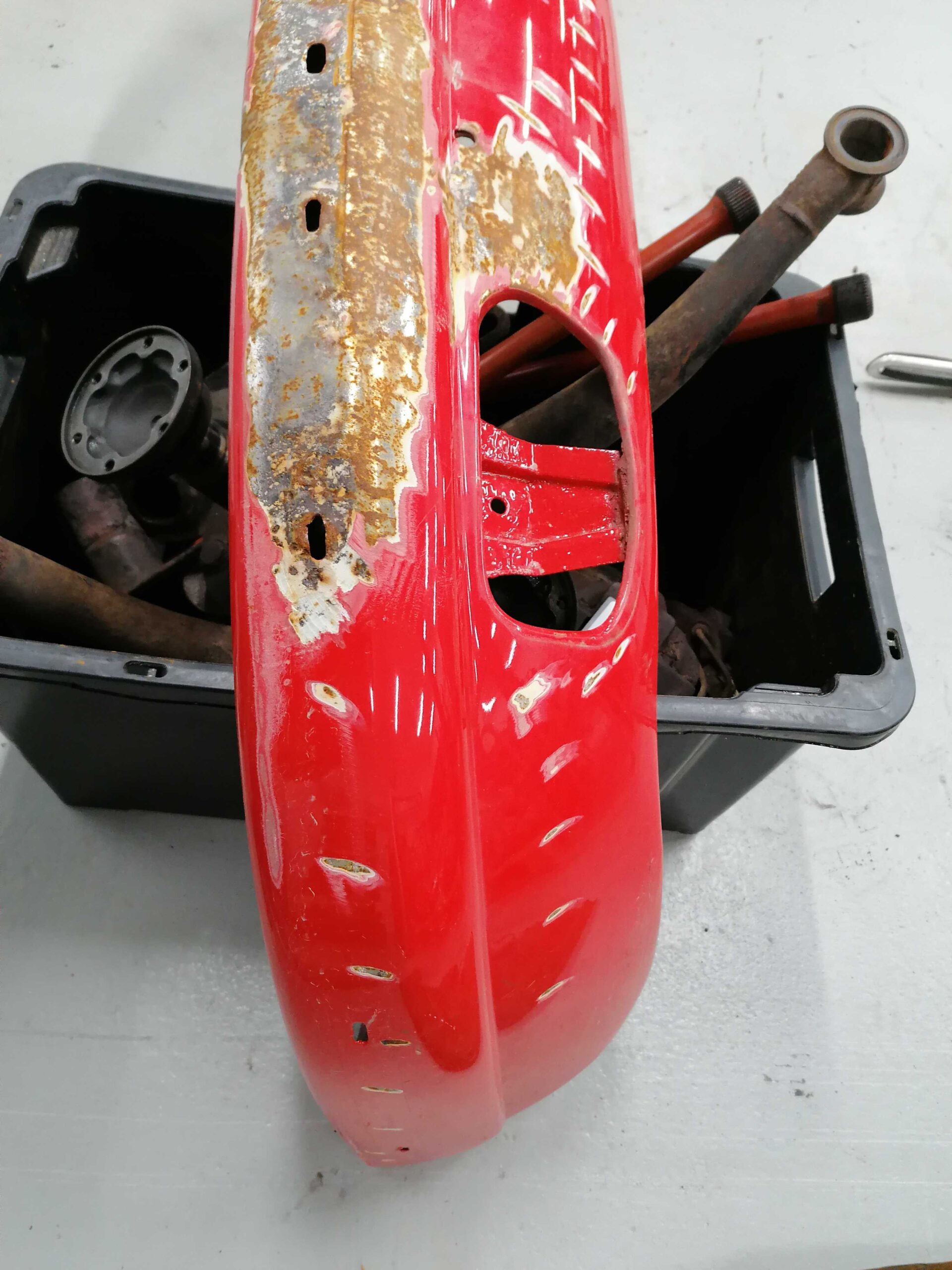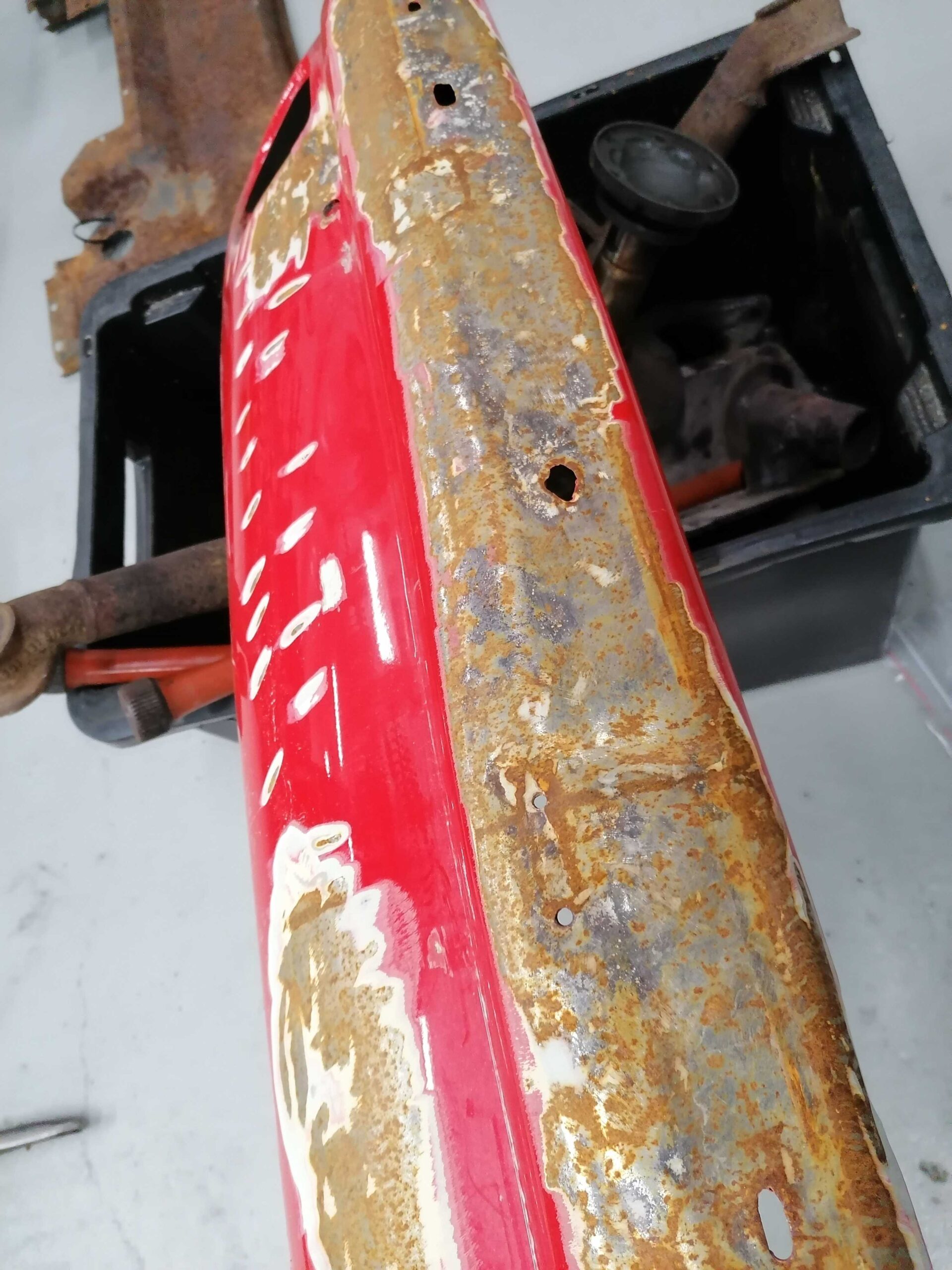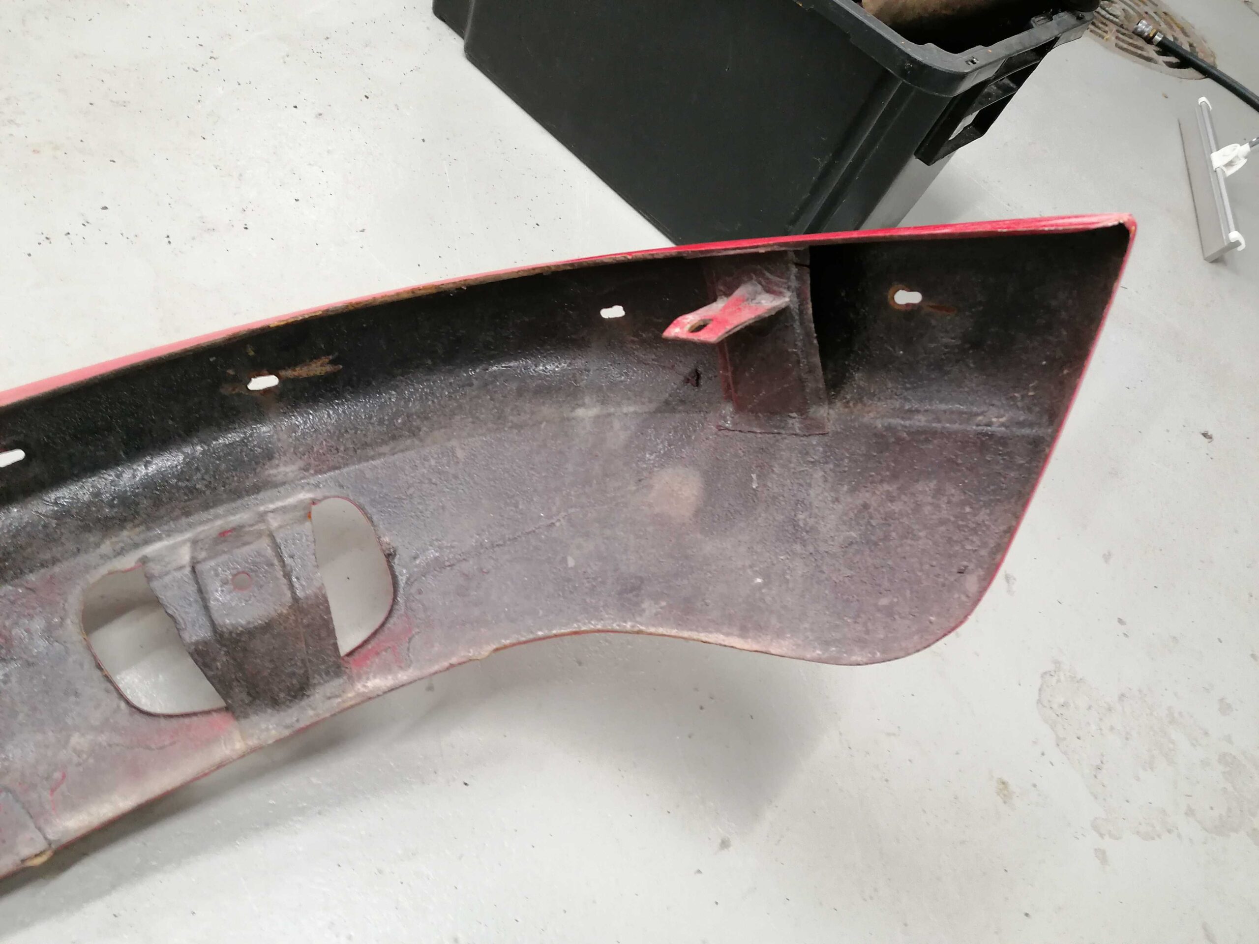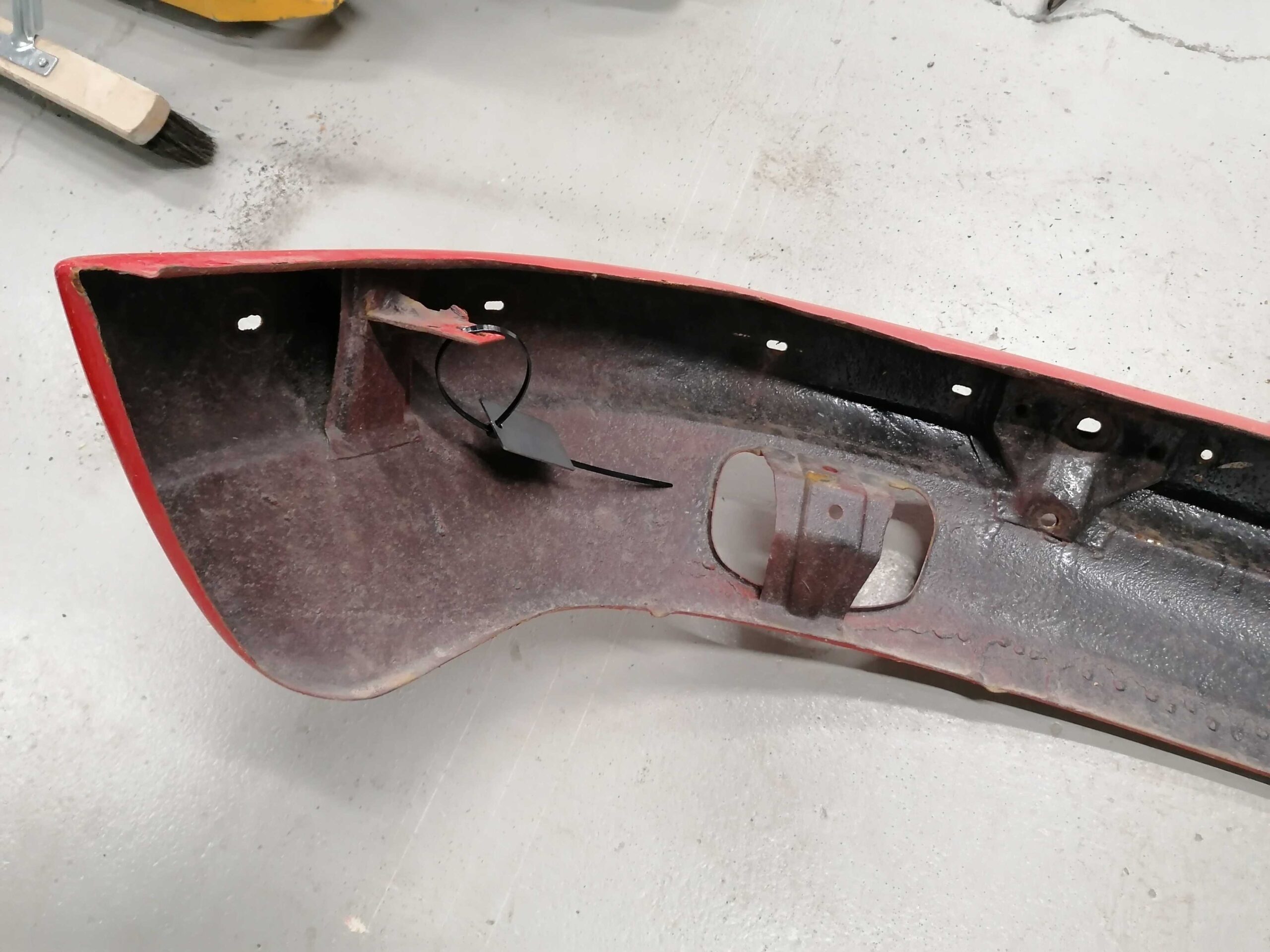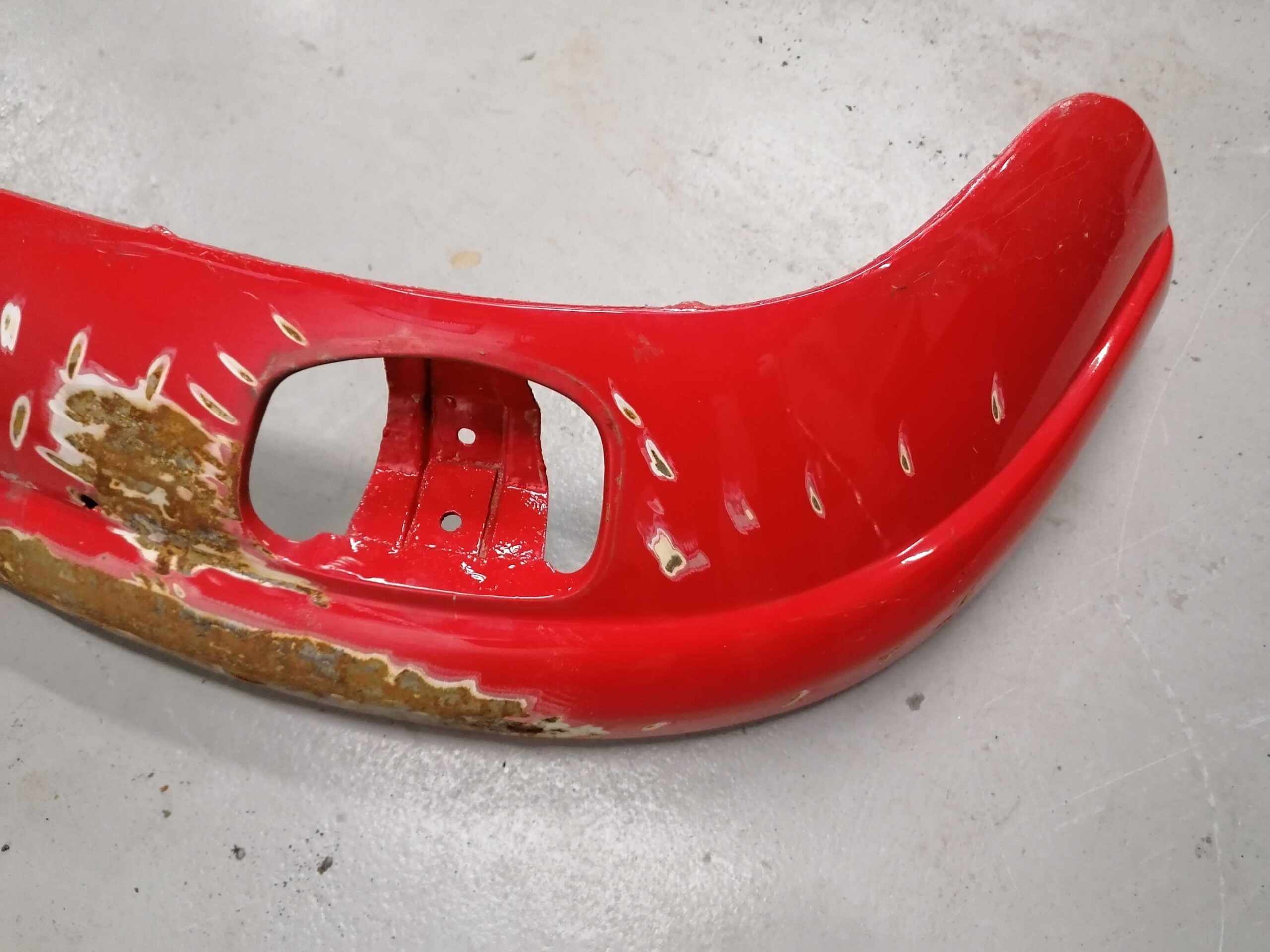 Porsche 912 Etupuskuri muutama lommo etuosassa missä ei ole maalia / Porsche 912 Front bumper few dents in there where is no paint