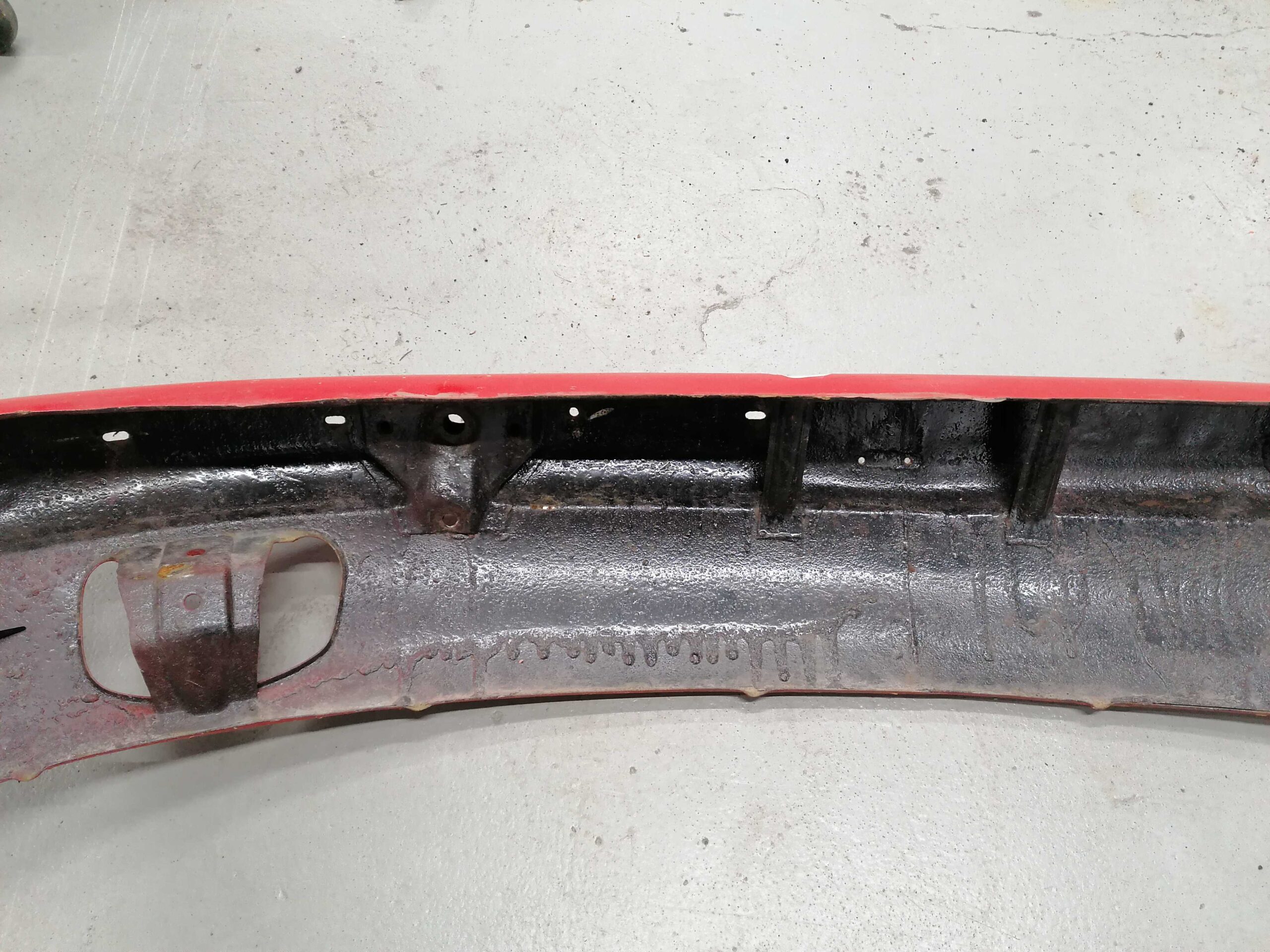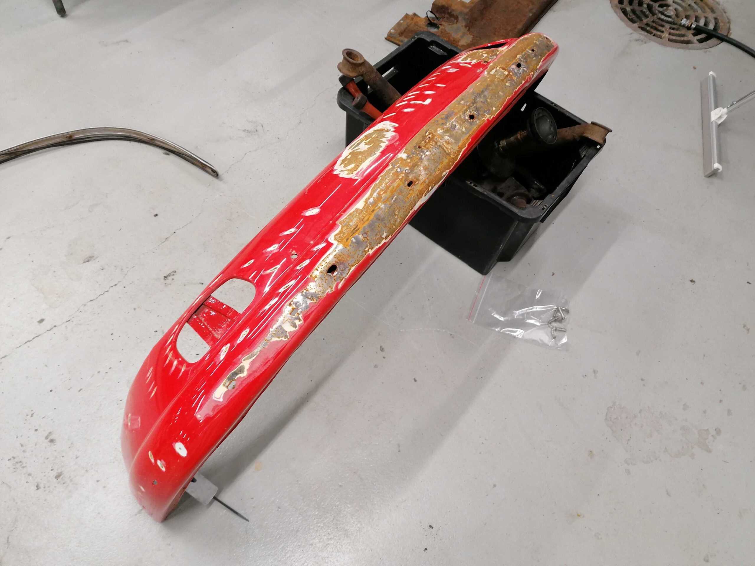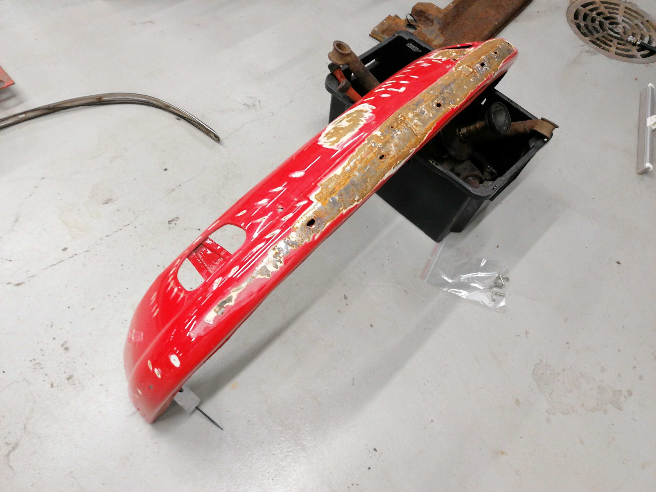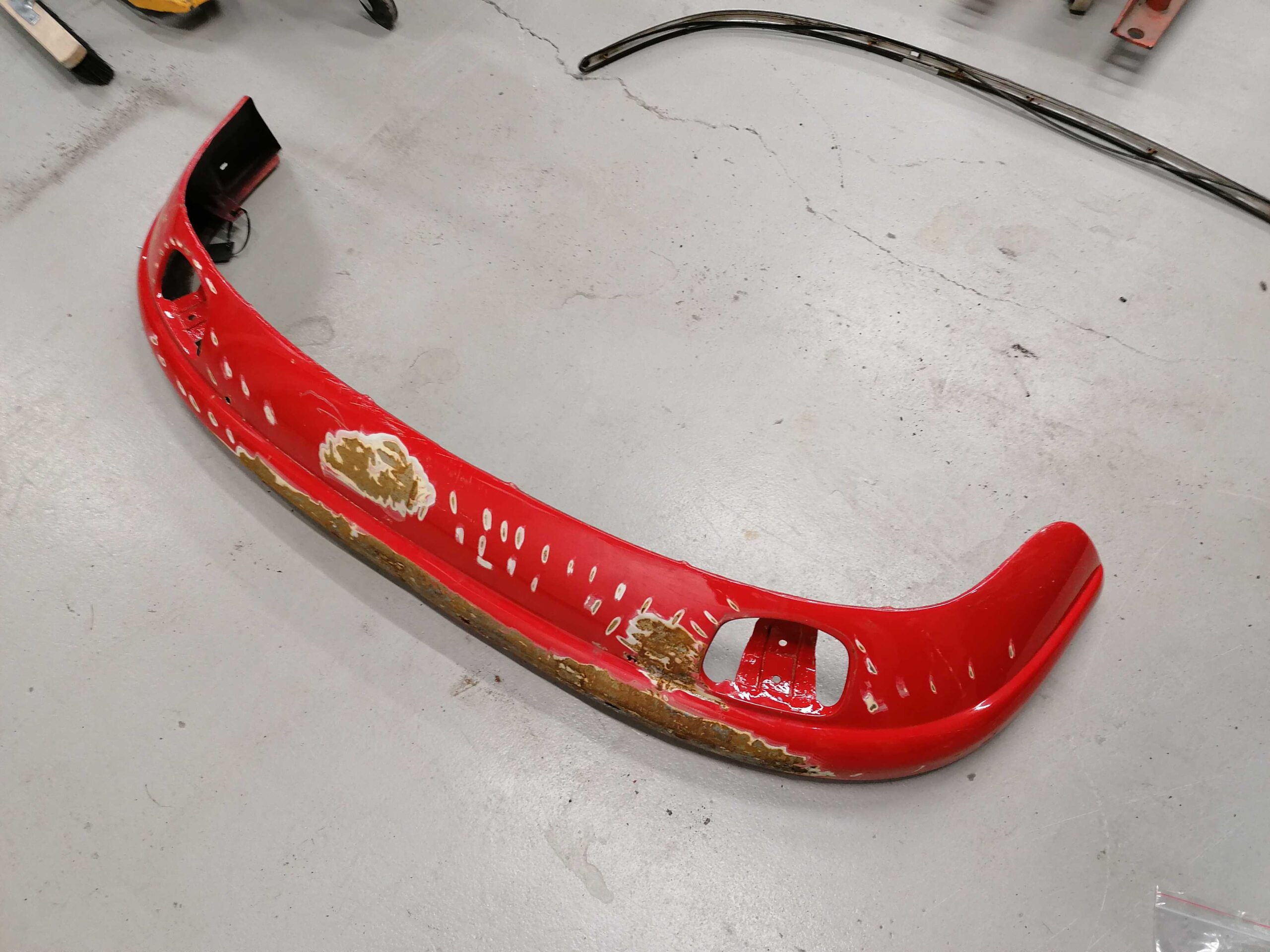 Porsche 912 Etupuskuri muutama lommo etuosassa missä ei ole maalia / Porsche 912 Front bumper few dents in there where is no paint quantity